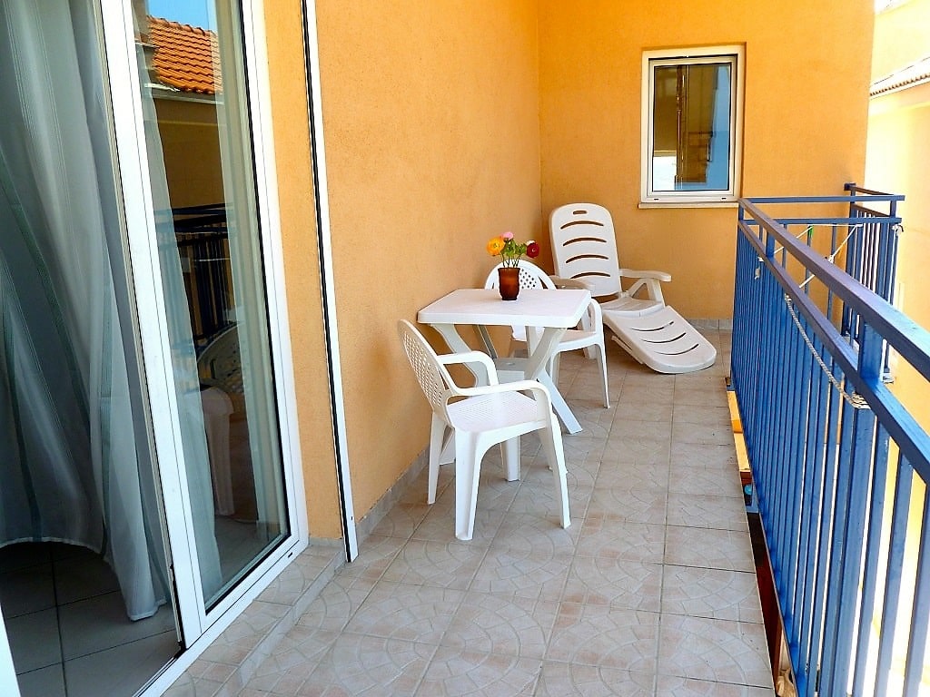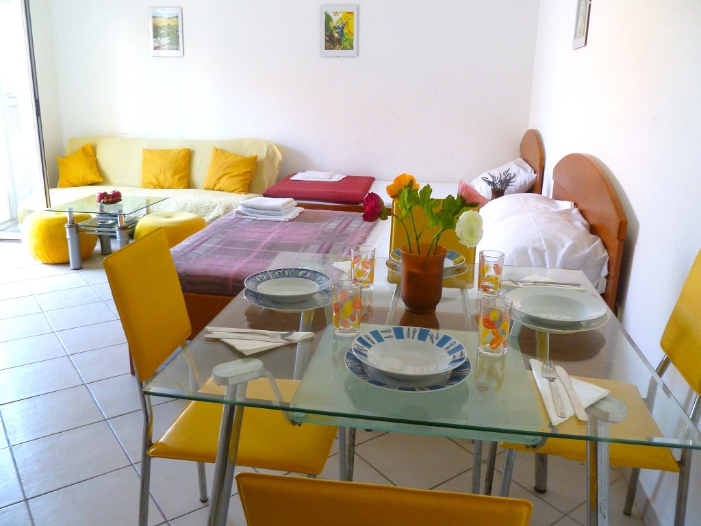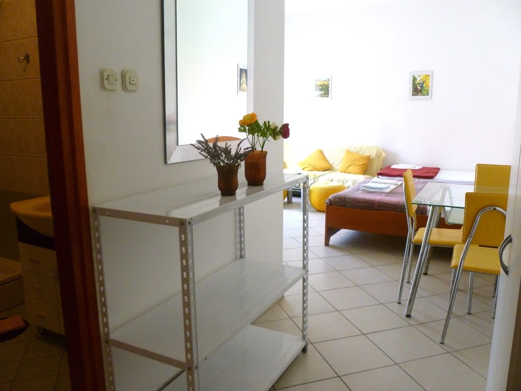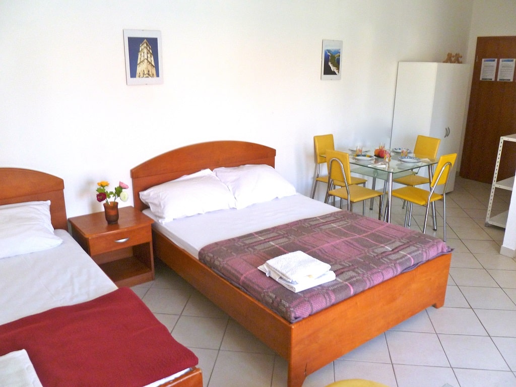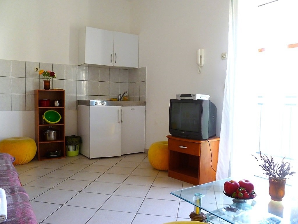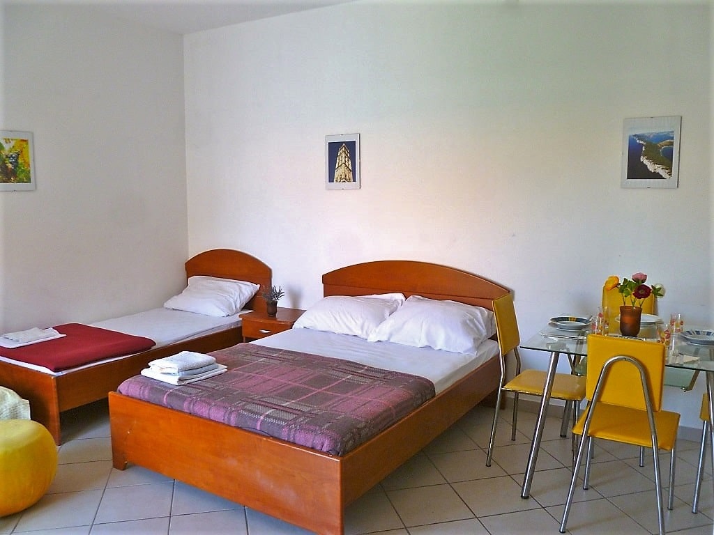 tudio apartment 1 (3+1) is on 1st floor of Villa Maria and has 35 m2 + balcony (5m2), but is without sea view (west oriented). Studio apartment means everything is in one room - 35 m2 (1 double bed, 1 single bed and 1 couch), kitchen (with fridge and all dishes necessary for cooking) + bathroom with shower bath. Apartment has air condition, sat TV, and parking is secured (next to the house).