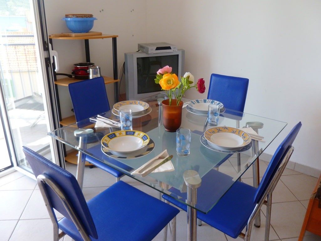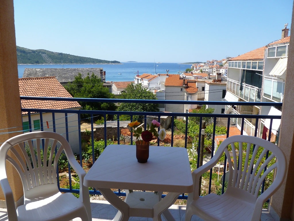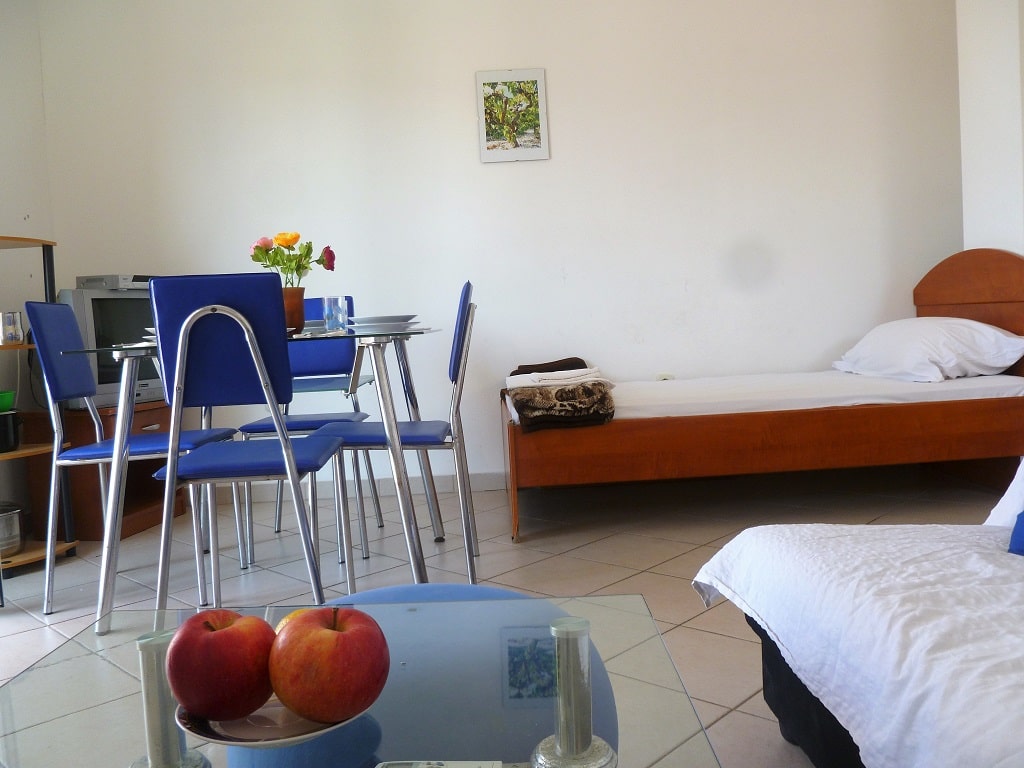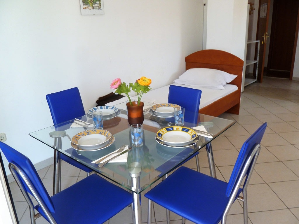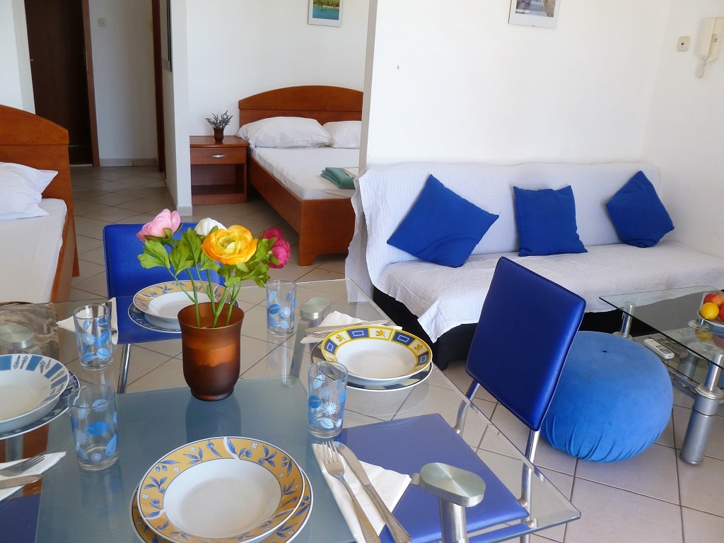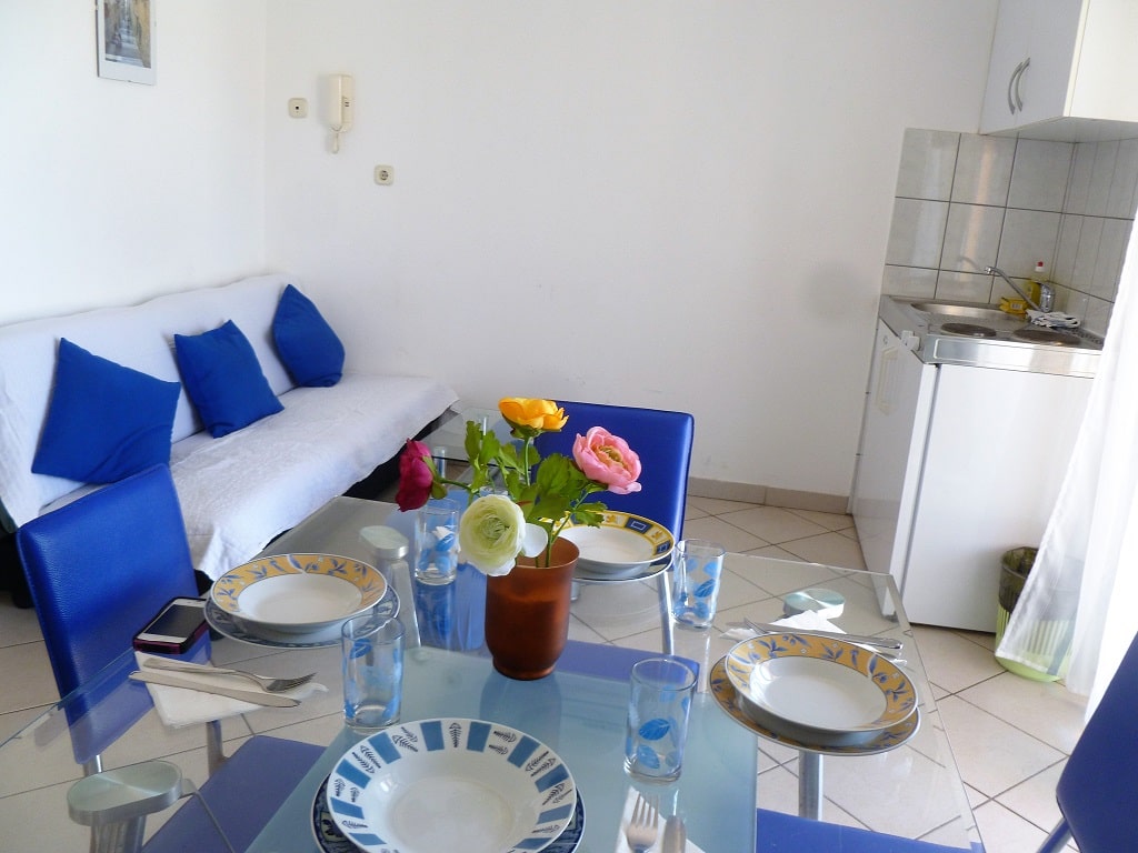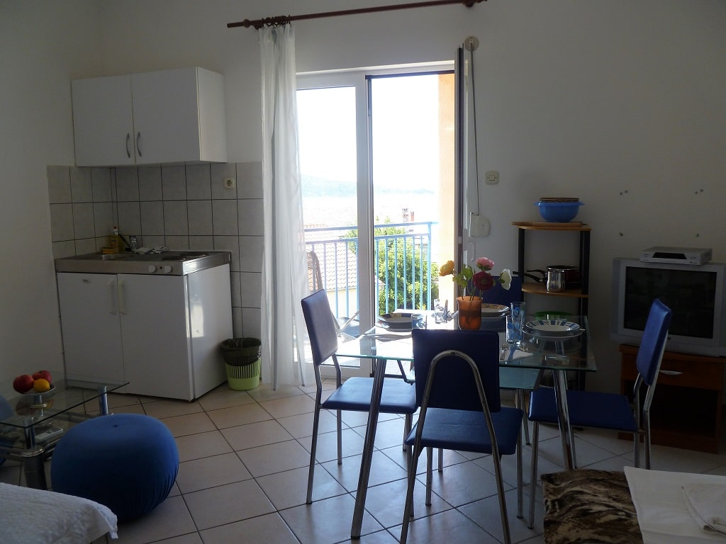 tudio apartment 3 (3+1) is on 1st floor of Villa Maria and has 35 m2 + balcony (5m2) with beautiful sea view (south oriented). Studio apartment means everything is in one room - 35 m2 (1 double bed, 1 single bed and 1 couch), kitchen (with fridge and all dishes necessary for cooking) + bathroom with shower bath. Apartment has air condition, sat TV, and parking is secured (next to the house).