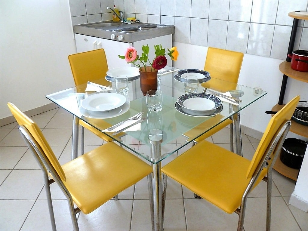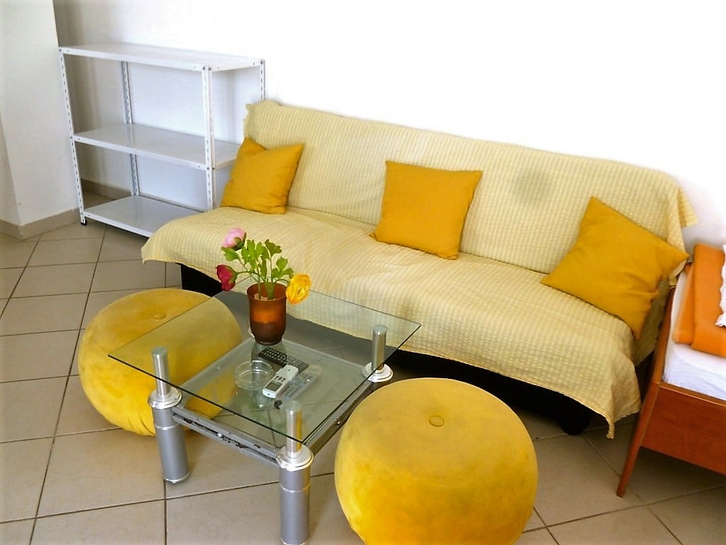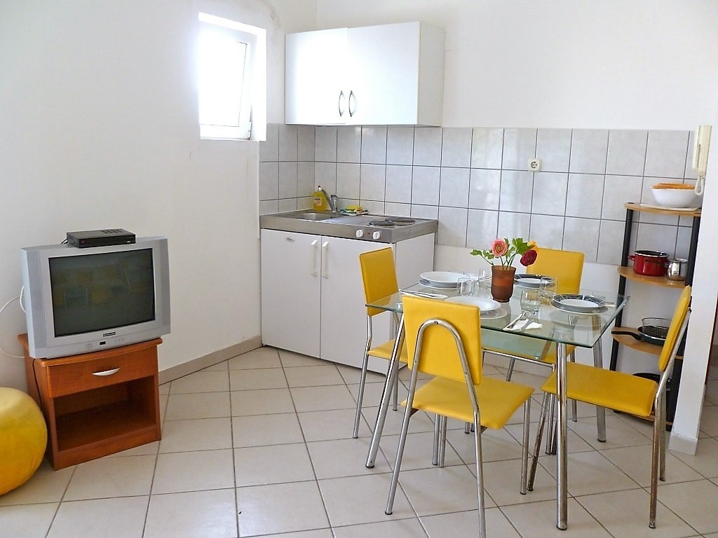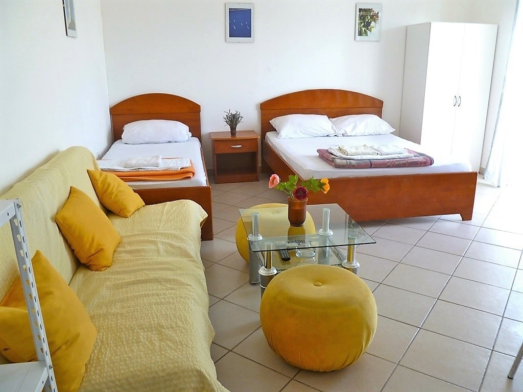 tudio apartment 6 (3+1) is on 2nd floor of Villa Maria and has 35 m2 + balcony (5m2) with beautiful sea view (south-east oriented). Studio apartment means everything is in one room - 35 m2 (1 double bed, 1 single bed and 1 couch), kitchen (with fridge and all dishes necessary for cooking) + bathroom with shower bath. Apartment has air condition, sat TV, and parking is secured (next to the house).